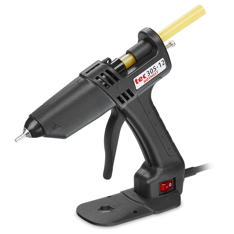 Light industrial 12mm (½”) glue gun, lightweight and easy to use, illuminated on/off switch, removable stand, adjustable full hand trigger and replaceable nozzle.